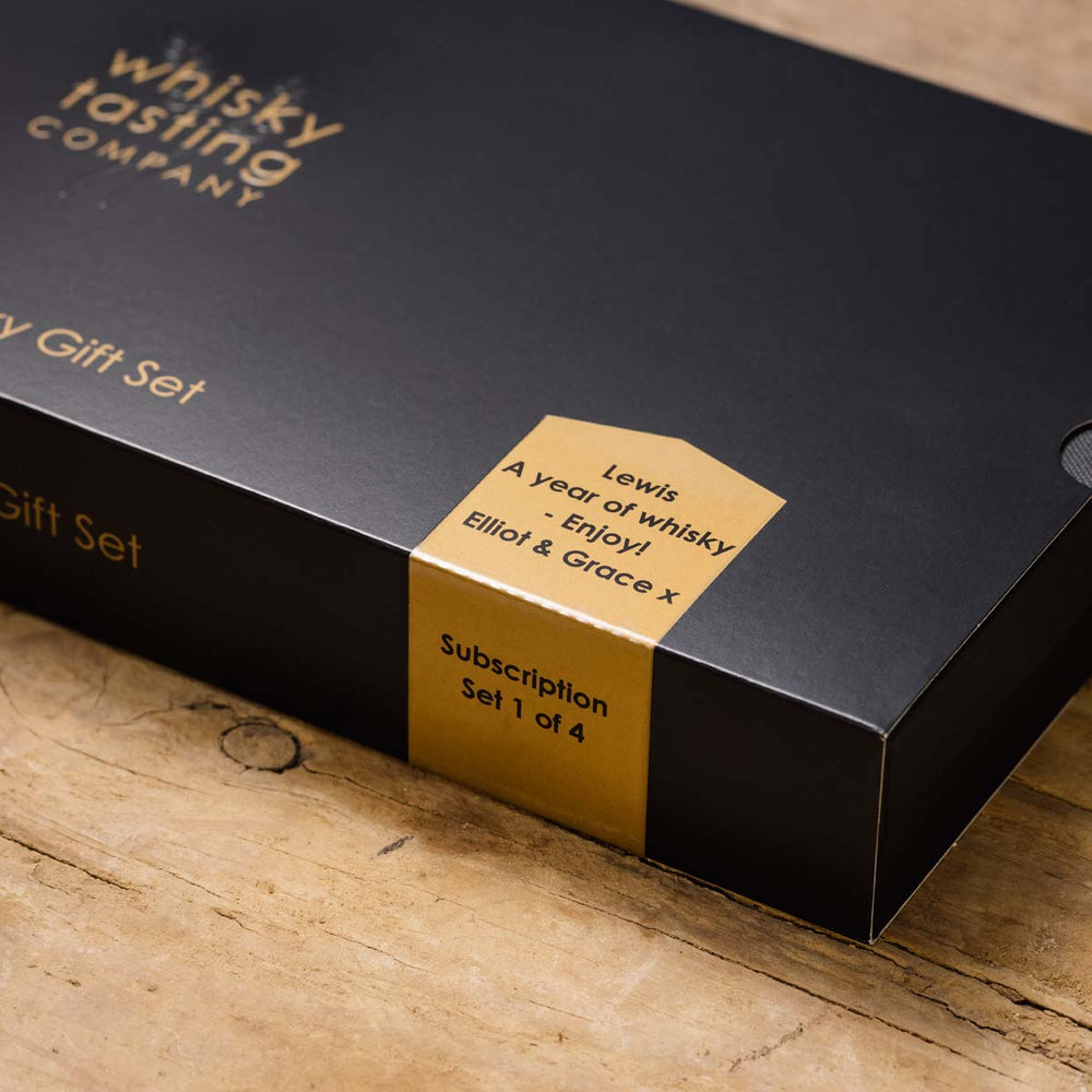The first tasting set is beautifully presented in a luxury hand finished gift box, and the price includes branding of your first whisky set (see image). Subsequent sets are presented in our plain brown packaging.